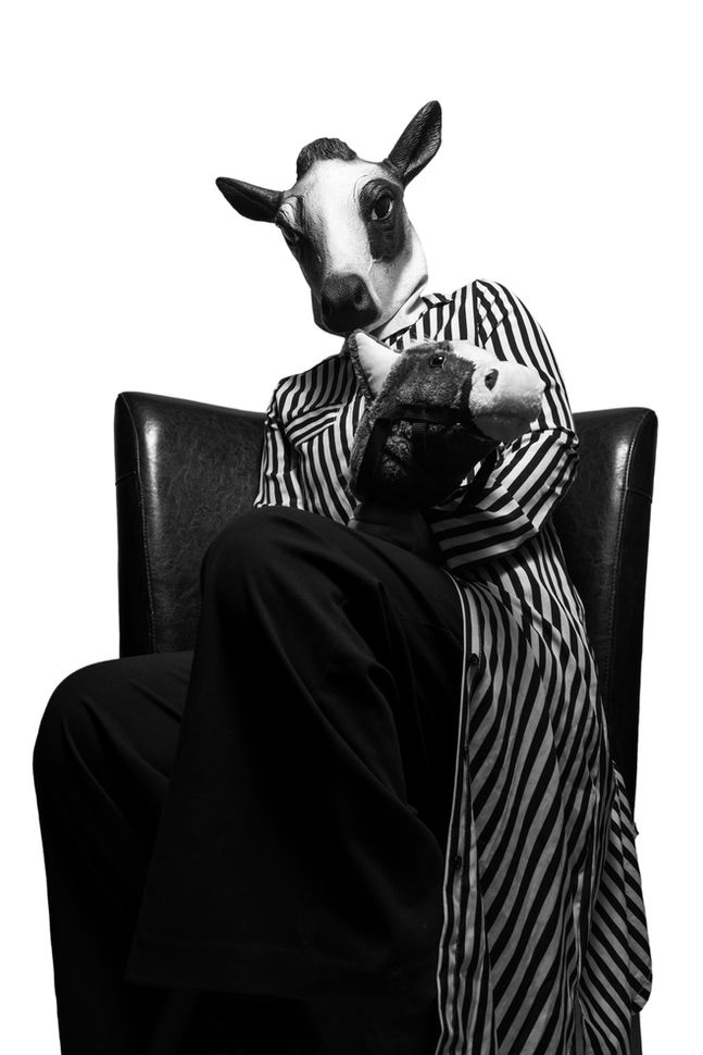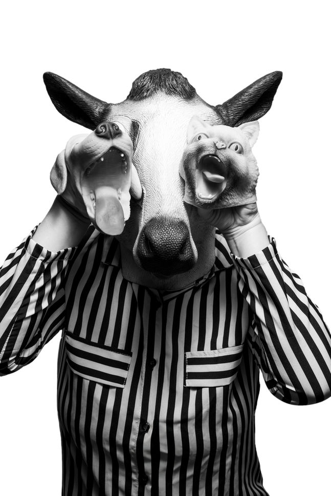 In this portrait series, I use the cow as a symbol to explore the contradictions in how we relate to animals through play, consumption, fashion, and power. The mask becomes a lens through which identity and ideology intertwine. The images shift from confronting the politics of carnism and cultural domination to exposing the absurdity and cruelty woven into play and style. These portraits are not just about wearing a cow mask, but about what it means to be one. To question the systems and stories that allow us to consume, disguise, and define ourselves through other beings.